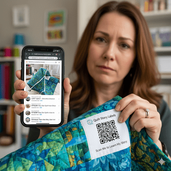 A quilter, let's call her Elizabeth, had her prize-winning quilt stolen from her car while it was being transported home from a show. Weeks later, the thief attempts to sell the quilt to a consignment shop specializing in handmade items. The sharp-eyed shop owner, wary of high-value items without documentation, notices the Quilt Story Label and scans the QR code.
